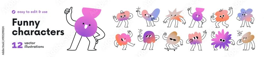 Fototapeta Set of funny doodle blobs, funky figures. Abstract cartoon shapes characters with happy smiling faces, emotions, expressions. Cute comic emoji. Flat vector illustration isolated on white background