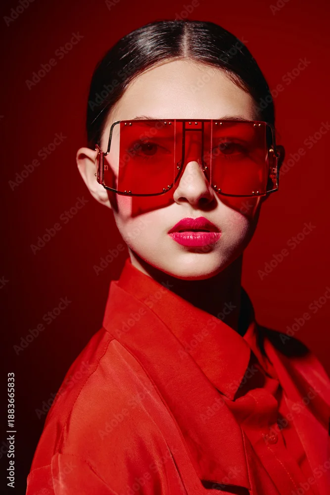 Stylish woman wearing red oversized sunglasses and vibrant red makeup poses against red background. Fashion concept focuses on beauty, creativity, and color coordination.