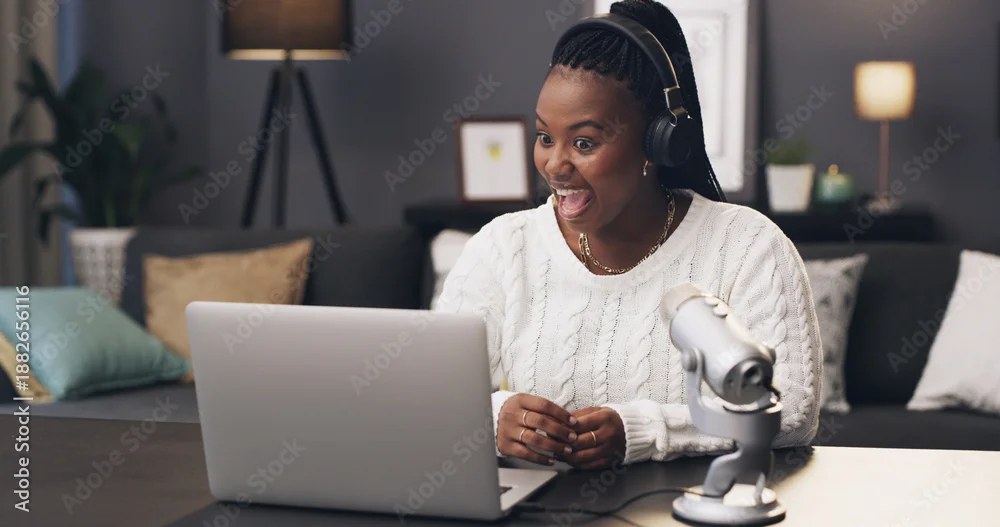 Surprise, podcast and laptop with black woman in home for subscription goal, social media and brand endorsement. Content creation, microphone and broadcast editing with person in apartment for show
