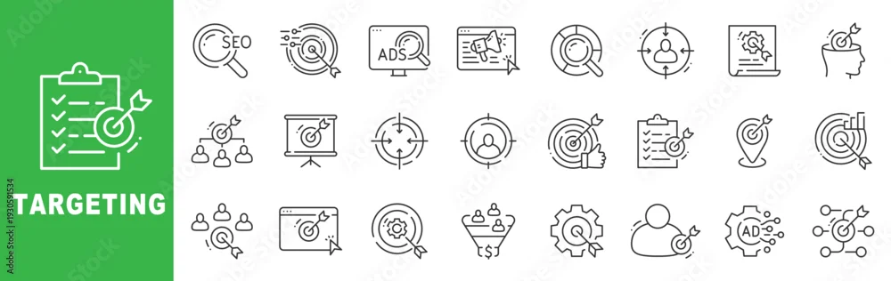 Fototapeta Targeting outline icon set featuring SEO, digital advertising, audience segmentation, analytics, conversion goals and marketing strategy in editable stroke line style - do przedpokoju - Picturewall.pl