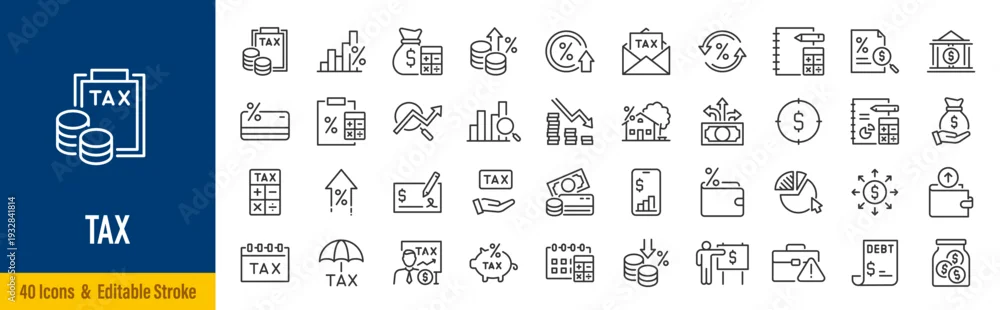 Fototapeta Tax web icons in line style. Pay, duties, interest rate, tax return, vat, tariff, personal tax, collection. Vector illustration. - do przedpokoju - Picturewall.pl