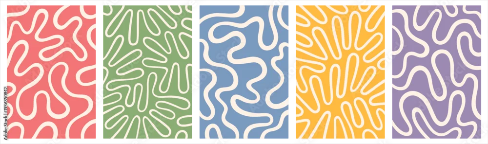 Fototapeta Twisted continuous lines curved wiggling stripes waves vector backgrounds set. Liquid retro groovy hippie patterns collection. Doodle uneven hand drawn wavy organic winding lines