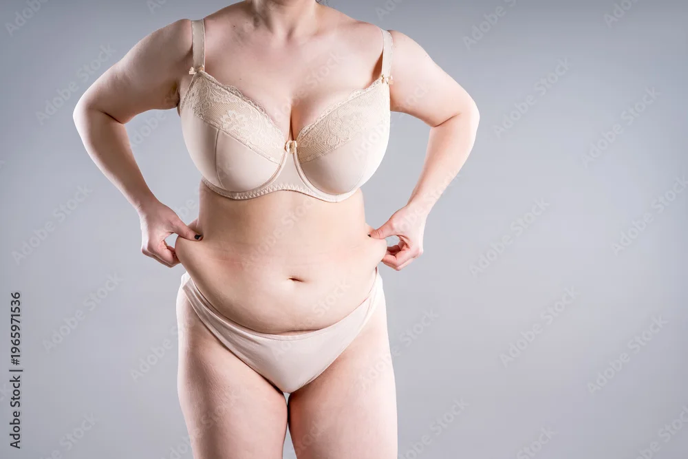 Fototapeta Unrecognizable plus size woman in beige lingerie pinching belly fat. Concept of weight loss, diet and liposuction