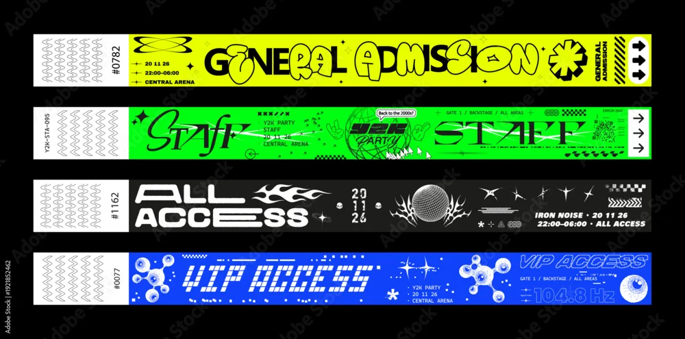 Fototapeta Y2K Event Ticket Wristband Set with VIP and All Access, Staff, General Admission Passes. Acid neon event wristband and ticket templates featuring. Y2K paper pass, admission, access. Vector set