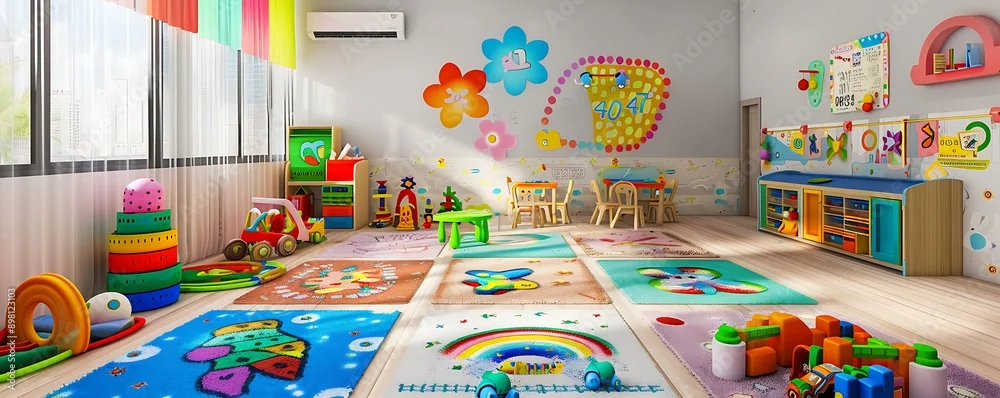 A brightly decorated kindergarten classroom with colorful rugs, educational toys, and vibrant wall art. The room is inviting for young learners.