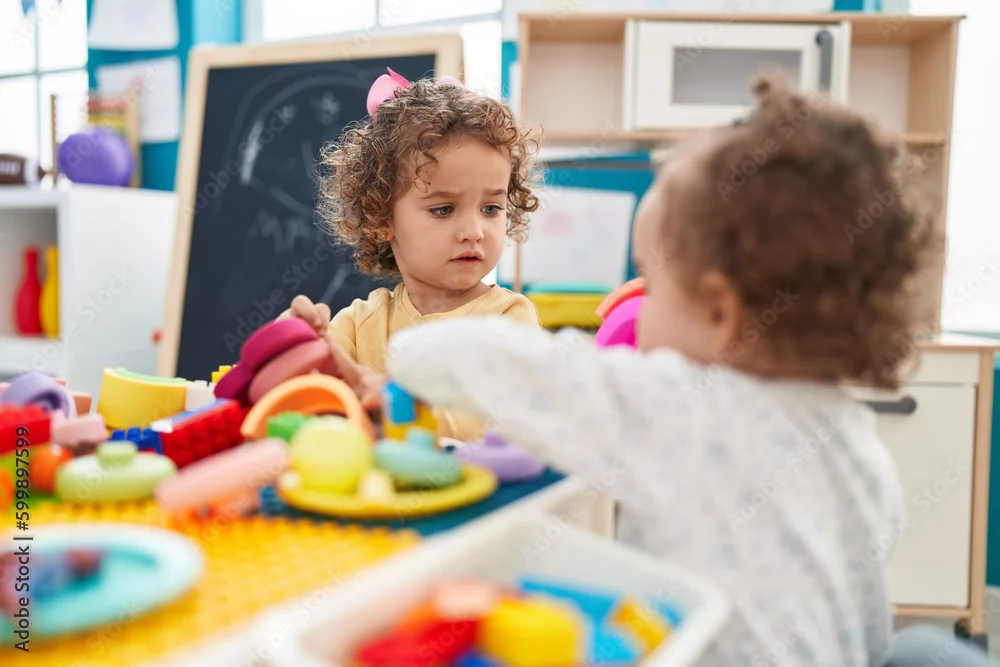 Fototapeta Adorable girls playing with construction blocks sitting on table at kindergarten