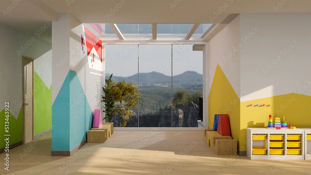 Fototapeta Beautiful modern colourful kindergarten classroom or kid nursery playroom interior with decor. - do przedszkola - Picturewall.pl
