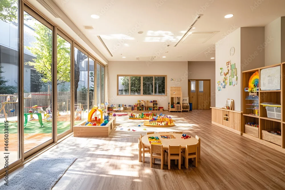 Bright and spacious kindergarten room with toys, tables, and natural light, creating a welcoming and stimulating environment for children's learning and play