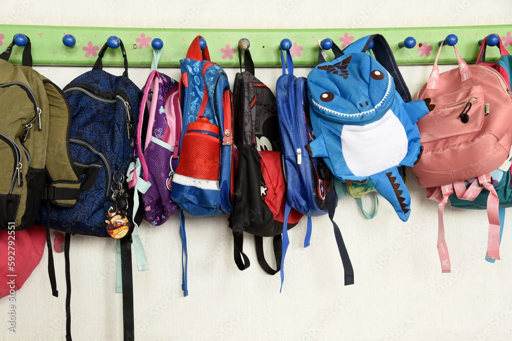Fototapeta Cali-Colombia February 14, 2023, backpacks hanging on a hanger at school, kindergarten, children's name suitcases - do przedszkola - Picturewall.pl