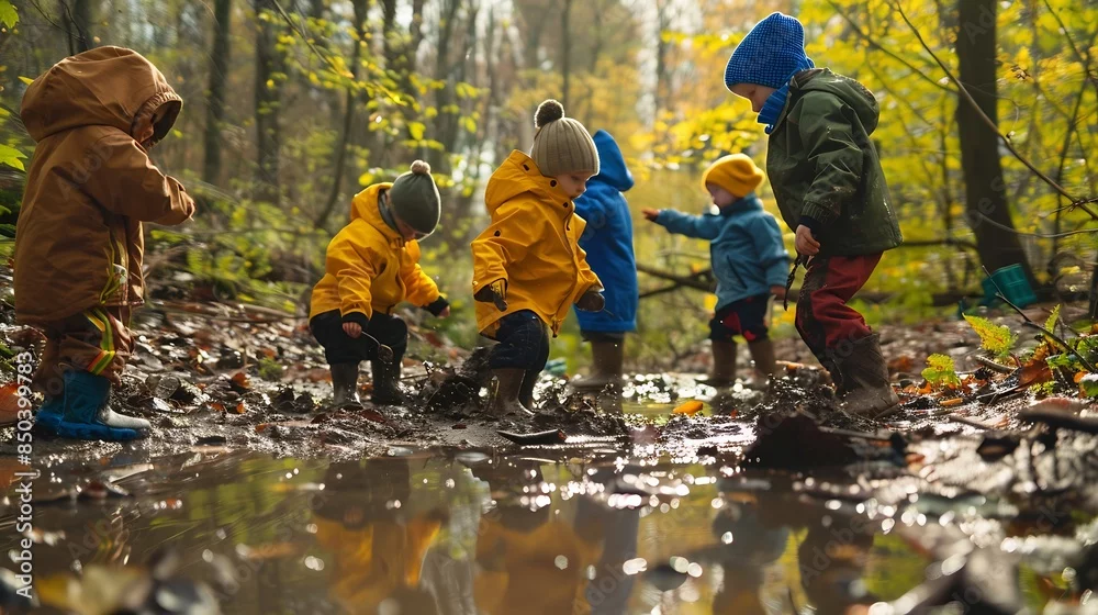 Fototapeta forest kindergarten Happy Preschool group of children play in the swamp in park or forest Outdoors small child have fun playing with mud in a woods Hike Scandinavian curious leisure in : Generative AI - do przedszkola - Picturewall.pl