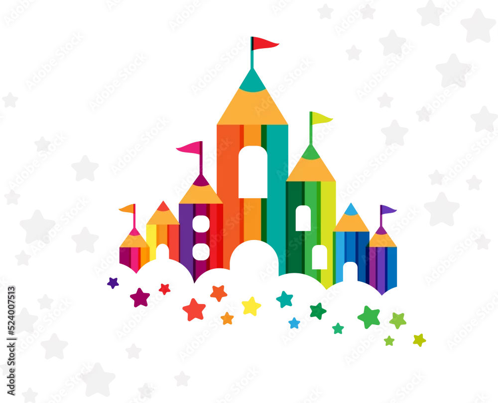 Kids castle from colorful pencils. Childhood fantasy fort with rainbow towers. Decoration element for design kids club, preschool room or kindergarten