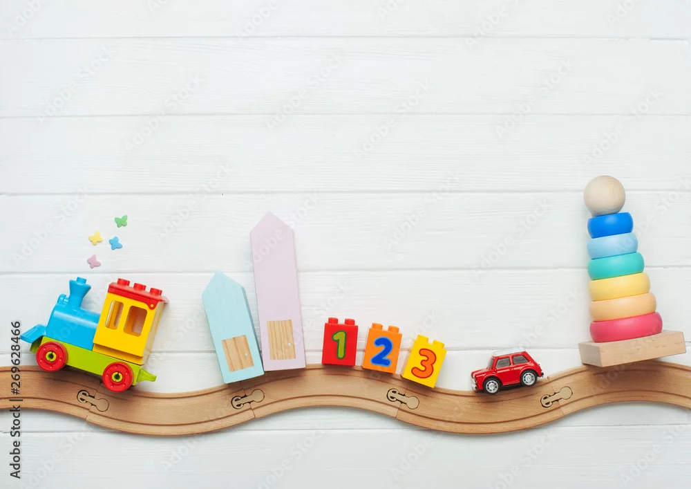 Fototapeta Kids toys on toy wooden railway on white wooden background - do przedszkola - Picturewall.pl