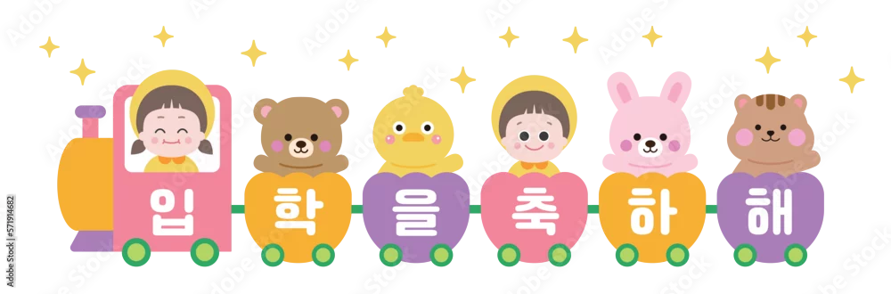 Kindergarten entrance ceremony banner design. There are children, bears, ducks, rabbits and squirrels on the train. It says 'Congratulations on your admission' in Korean.
