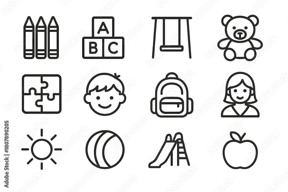 Fototapeta Kindergarten Icon Set. Kindergarten fun. Line icon set of kindergarten fun: crayons, toy blocks, swing, teddy bear, puzzle, smiling child, backpack, teacher,
