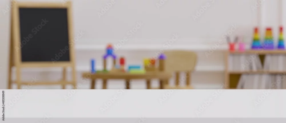 Fototapeta Modern white tabletop with copy space over blurred kindergarten classroom - do przedszkola - Picturewall.pl
