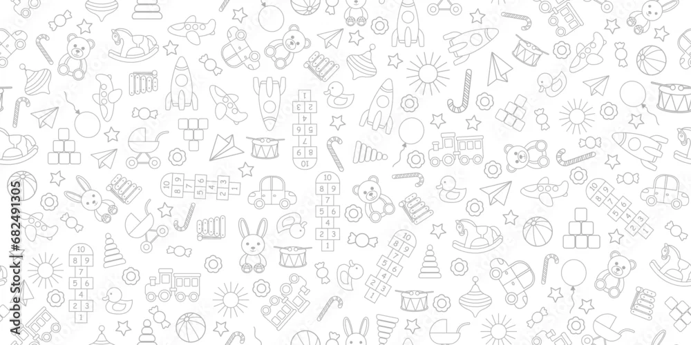 Fototapeta Preschool kindergarten doodle line seamless pattern. Cute daycare hand drawn elements. - do przedszkola - Picturewall.pl