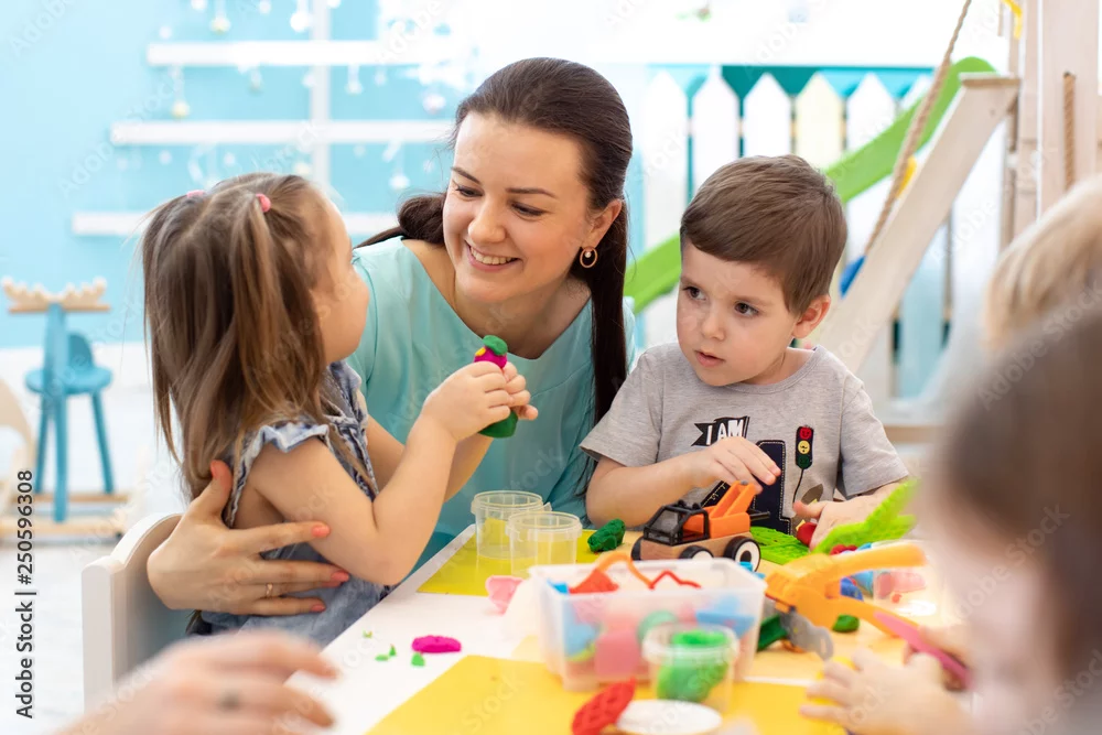 Fototapeta Teacher with kids working with plasticine at kindergarten or playschool - do przedszkola - Picturewall.pl