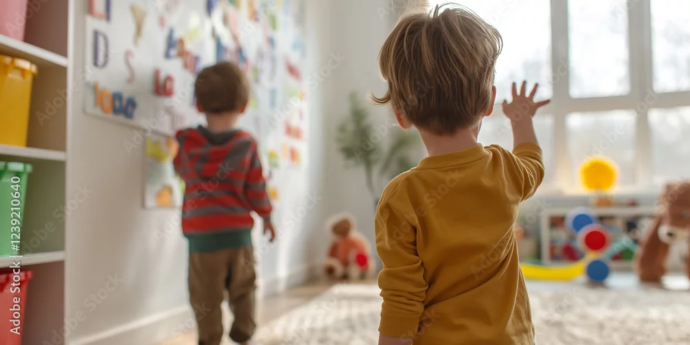 Fototapeta Two boys playing and learning in kindergarten classroom - do przedszkola - Picturewall.pl