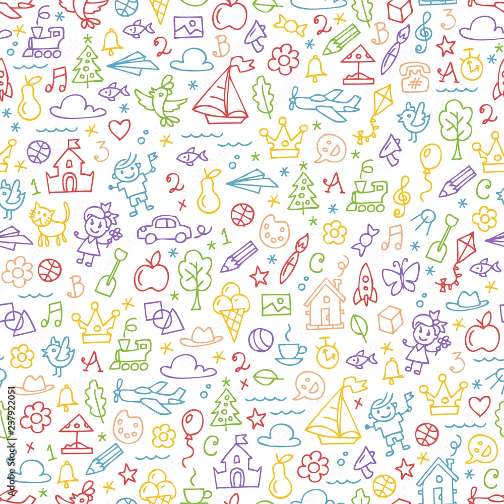 Fototapeta Vector children drawing sketch color outline doodles seamless background with kids hand drawn painting cartoon colorful elements and symbols for kindergarten and preschool pattern.