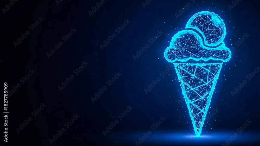 Fototapeta A glowing neon blue ice cream cone, intricate lines and dots. Futuristic low-poly network design. Blends technology, innovation, and future food experiences. - do restauracji - Picturewall.pl