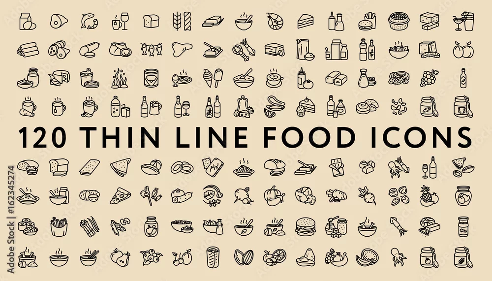 Fototapeta Big Set of 120 Thin Line Stroke Food Icons. Meat, milk, seafood, pasta, soup, bread, egg, cake, sweets, fruits, vegetables, drinks, nutrition, pizza, fish, sauce, cheese, butter, pie, nuts, snacks - do restauracji - Picturewall.pl