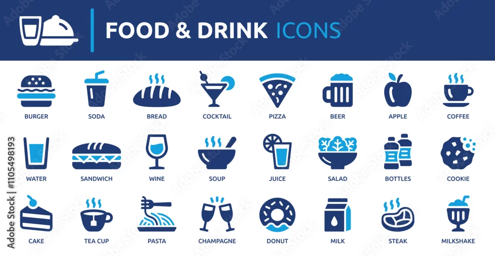 Fototapeta Food and drink icon set. Containing burger, soda, bread, cocktail, pizza, beer, apple, coffee, water and more. Solid vector icons collection. - do restauracji - Picturewall.pl