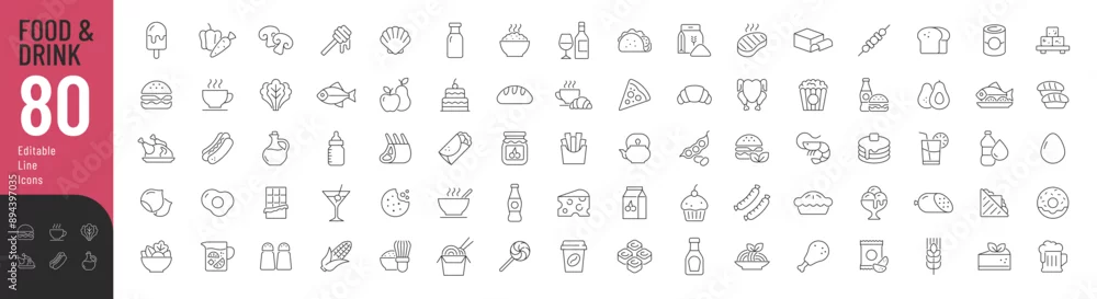 Food and Drink Line Editable Icons set. Vector illustration in thin line style of nutrition related icons: vegetables, fruits, desserts, meat, baked goods, drinks, and more. Isolated on white.