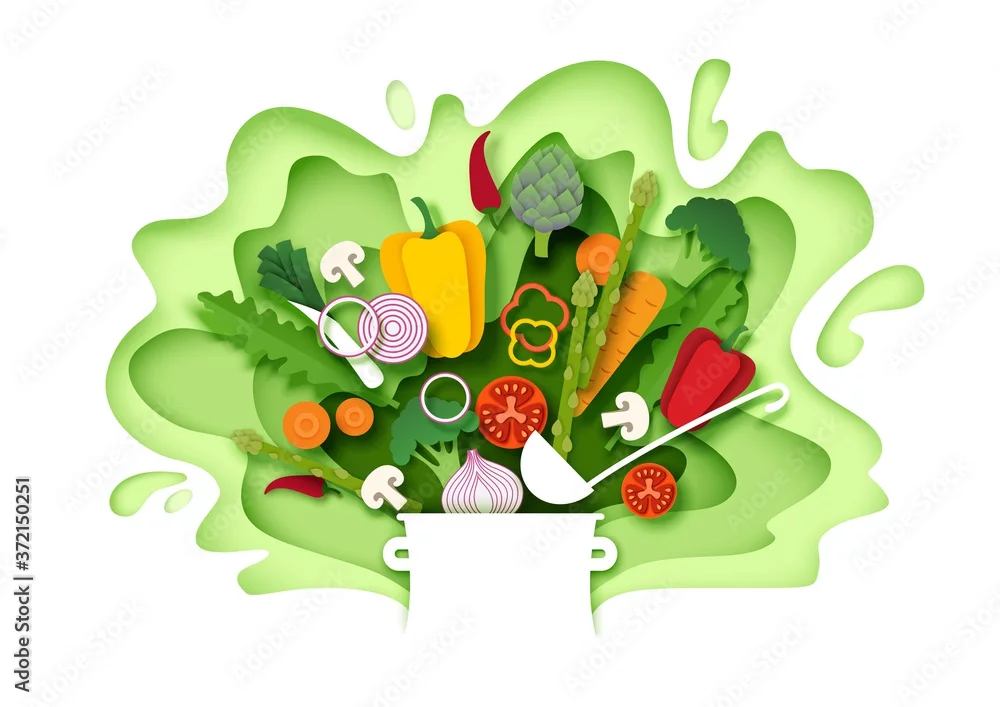 Fresh vegetables falling into the pot. Vector layered paper cut style illustration. Cooking food. Healthy meal. Natural organic food for menu poster banner template.