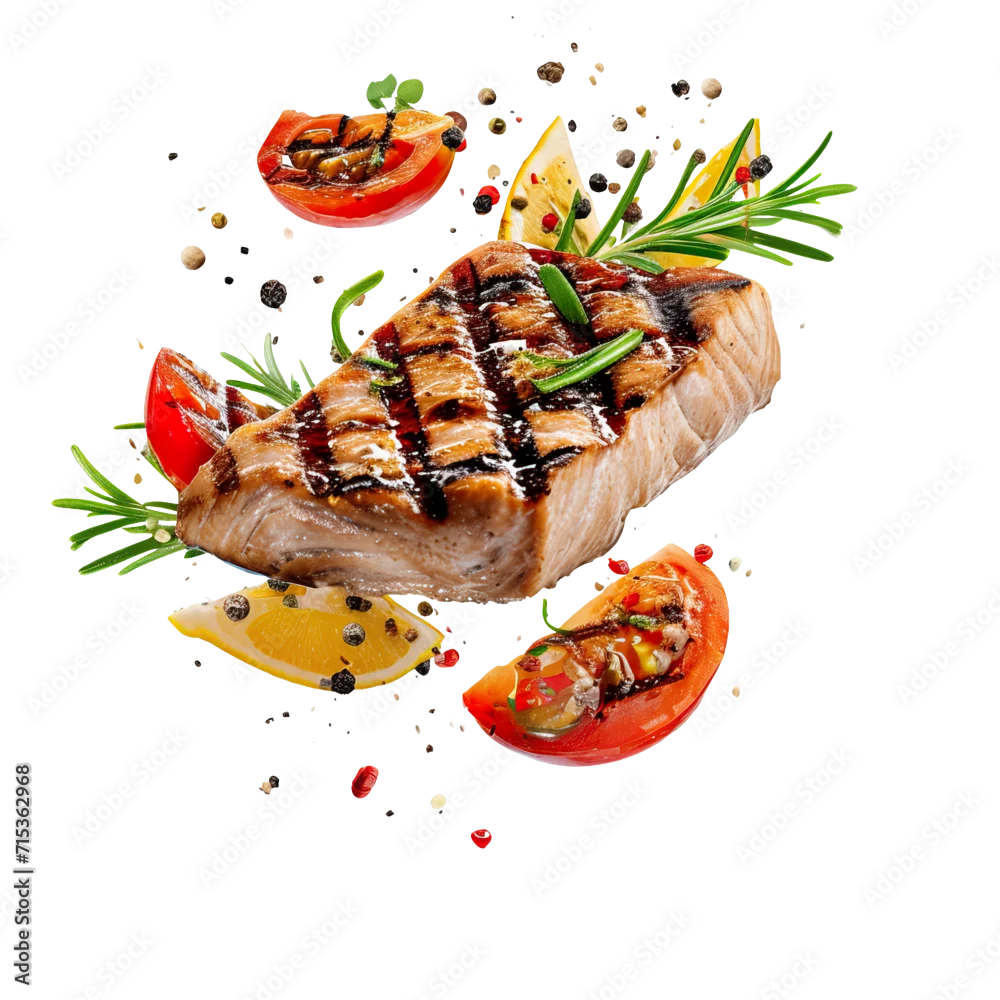 Fototapeta Grilled salmon steak with lemon, tomatoes and rosemary flying in the air, realistic 3d, meat collection, ultra realistic, icon, detailed, angle view food photo, steak composition