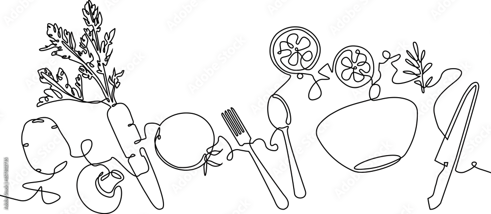 Fototapeta Horisontal continuous line drawing poster with utensils and food. Preparing the salad. Cooking process. Healthy eating. Culinary illustration. Vector background.