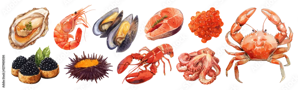 Fototapeta seafood watercolor set. oyster mussel shrimp red fish black caviar crab lobster squid sea urchin, animal delicacy food restaurant cooking vector illustration - do restauracji - Picturewall.pl