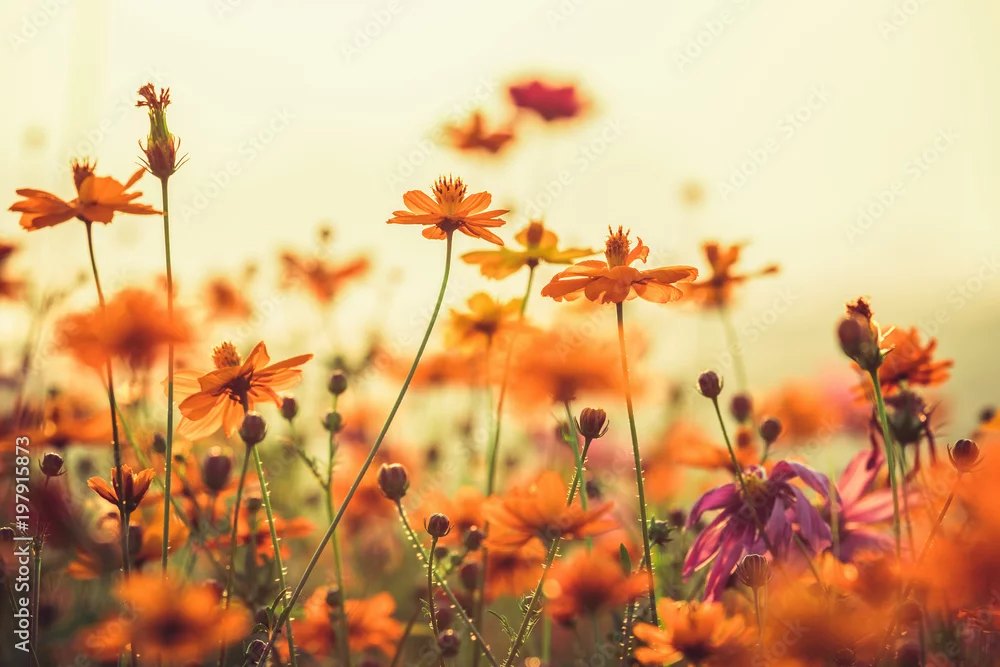 Fototapeta Kosmosu kolorowy kwiat w polu podczas zmierzchu w wiosna sezonie. Filtry na Instagram w stylu fotograficznym. Charakter tła