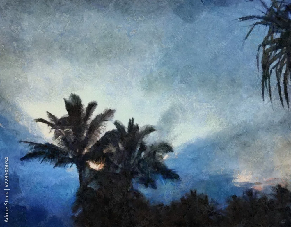 Fototapeta nowoczesny krajobraz i palmy tropikalne; akwarela suchym pędzlem