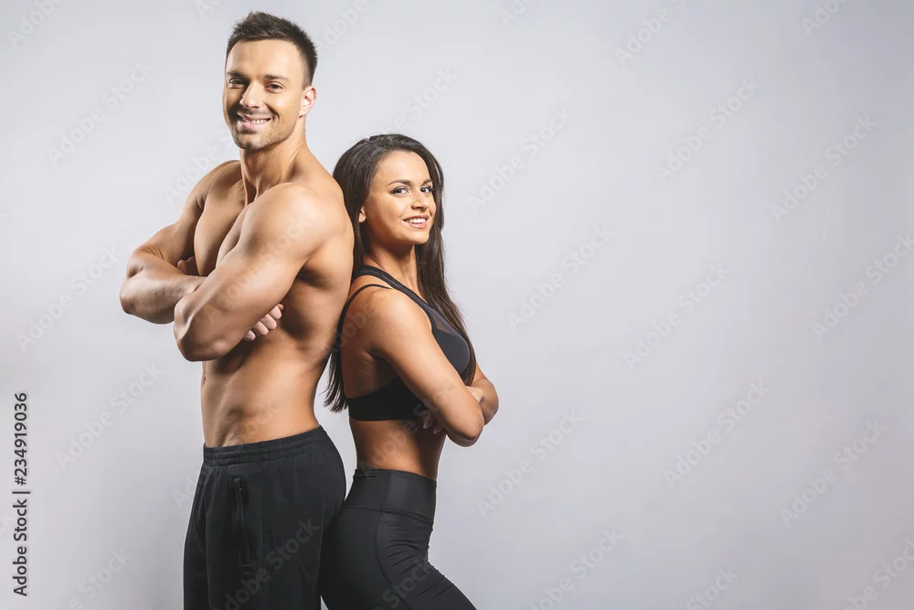 Fototapeta Athletic man and woman isolated over white background. Personal fitness instructor. Personal training. - do siłowni - Picturewall.pl