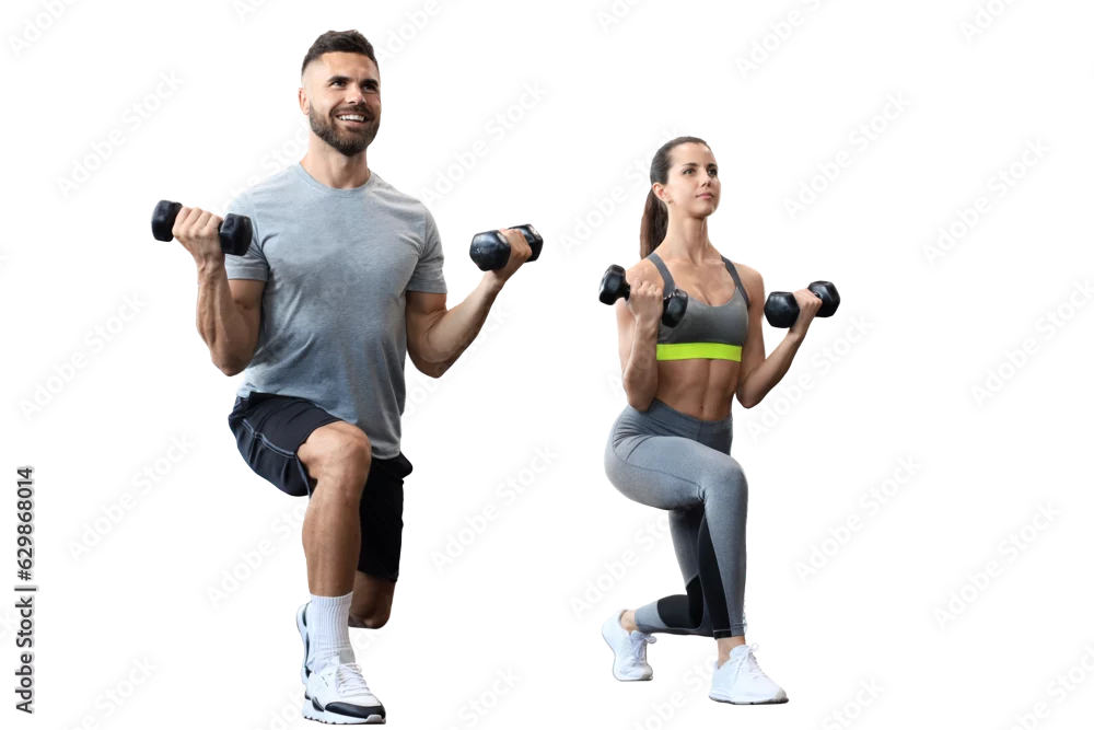 Fototapeta Attractive sports people are working out with dumbbells on a transparent background - do siłowni - Picturewall.pl