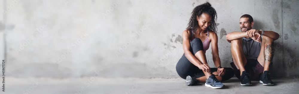 Fototapeta Couple, fitness and happy by banner on break, active and health or wellness. Positive people, smile and exercise by training, gym and space on gray background, performance and cardio workout at wall