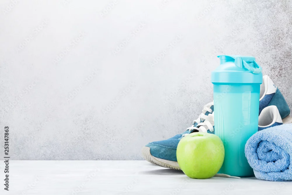 Fototapeta Fitness and healthy food concept - do siłowni - Picturewall.pl