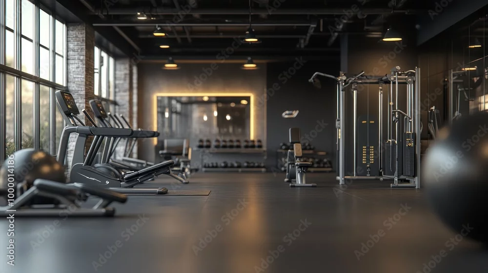Fototapeta Modern gym interior with exercise equipment and spacious layout for fitness activities.