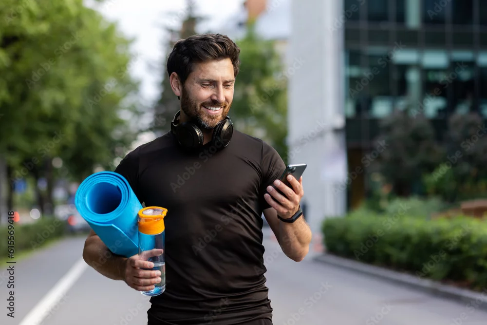 Portrait of mature successful adult athlete, bearded man going to workout, coach holding fitness mat and phone, browsing online app for joint physical training