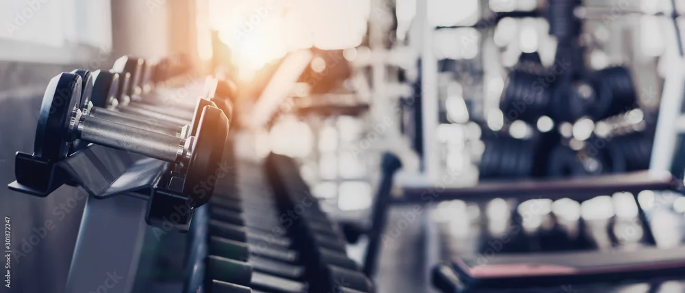 Fototapeta siłownia tło wnętrze hantle na stojaku w sali fitness i treningu
