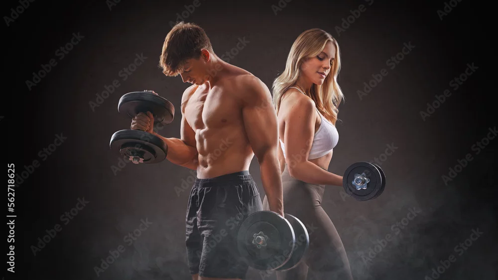 Fototapeta smiling woman an man with dumbbell - successful fitness studio concept - do siłowni - Picturewall.pl