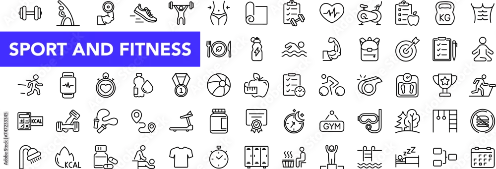 Sport and Fitness icon set with editable stroke. Healthy lifestyle thin line icon collection. Gym and health care icons. Vector illustration