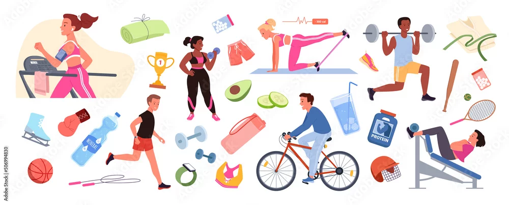 Sport workout set vector illustration. Cartoon people in sportswear training in gym, collection of fitness equipment and accessories for exercises, diet and vitamin supplements isolated on white