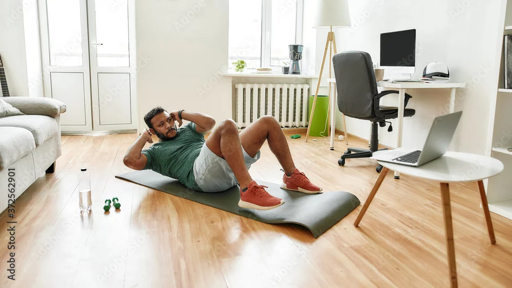 Fototapeta Your personal trainer. Male fitness instructor showing exercises while streaming, broadcasting video lesson on training at home using laptop. Sport, online gym concept