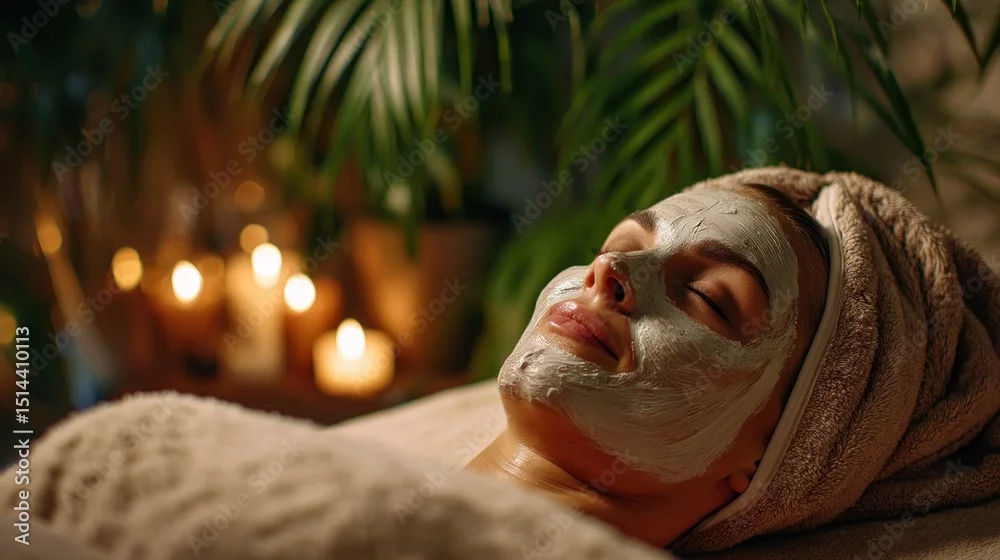 Fototapeta A woman enjoying a facial mask treatment with a towel wrap on her head, lying in a serene spa room with candles and green plants around. - do spa - Picturewall.pl