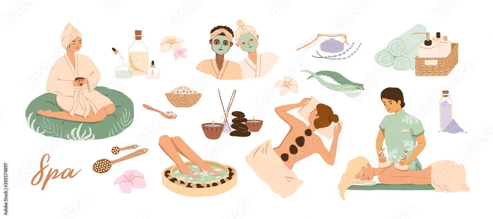 Centrum spa usługi płaskie ilustracje wektorowe zestaw. Odwiedzający salon piękności i pracowników postaci z kreskówek. Procedury centrum odnowy biologicznej i pakiet wyposażenia. Masaż gorącymi kamieniami, kąpiel stóp i maseczki na twarz.