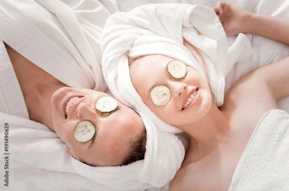 Fototapeta Fresh look. Happy nice positive mother and daughter lying together and smiling while doing a cucumber mask - do spa - Picturewall.pl