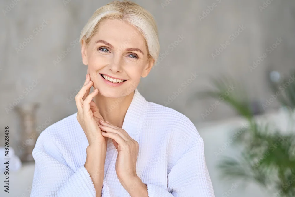 Headshot of happy smiling beautiful middle aged woman wearing bathrobe at spa salon hotel looking at camera touching face. Wellness spa procedures advertising. Skincare concept.