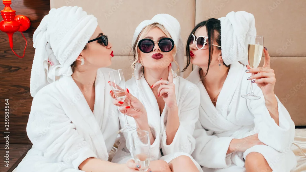 Fototapeta Impreza uroczystości w spa. Gratulacje dla przyjaciół. Młode kobiety z szampanem. Okulary przeciwsłoneczne, szlafroki i turbany włączone.