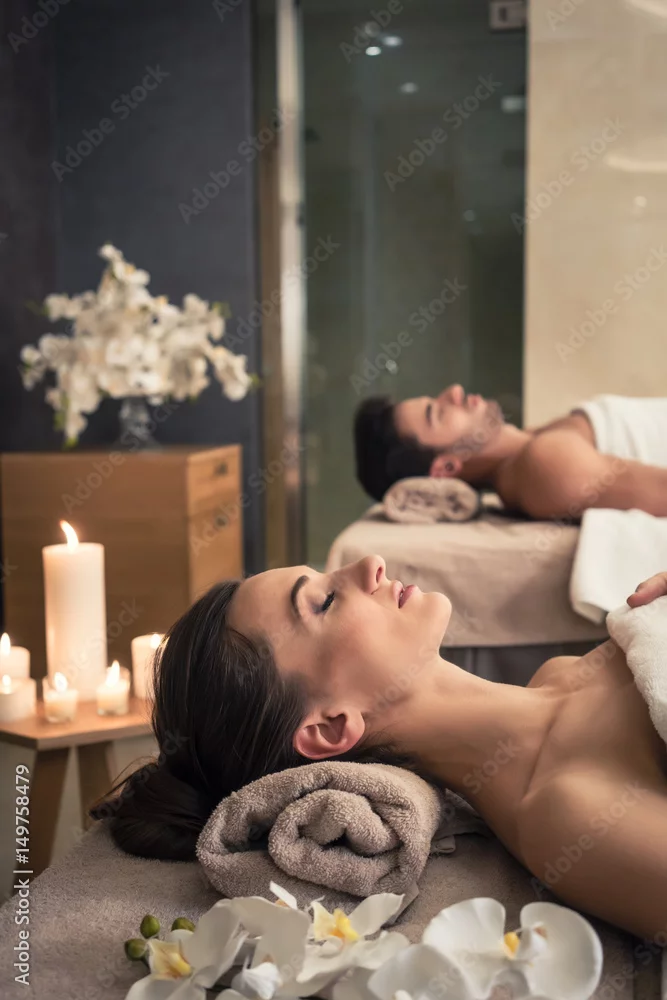 Fototapeta Mężczyzna i kobieta, leżąc na łóżkach do masażu w azjatyckim centrum odnowy biologicznej